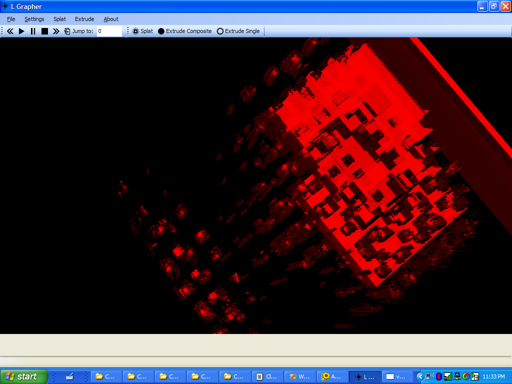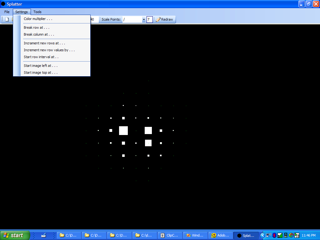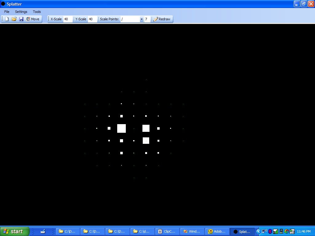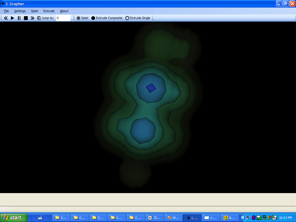 Brian read the sensor values while I recorded them in OpenOffice Calc. Each team member was given a single table of values for all of the data. Data Clean Up We began independent work on the project by completing our own data organization. I chose to create two different data sets form the recorded data. A comma separated point list with scalars, and a 2D image slice. I chose to to convert the spreadsheet file to comma separated values describing each point in a single tuple. The file format contains the x,y,z and sensor reading value for a single reading on each row. This file is parsed easily and is useful for scalar, point based visualizations. I also chose to convert the files to 2D image slices. I created the “splotter” (splat plotter) program to create height map-like images of the data. The splotter program reads any CSV file and draws 2D points on a black plane. Keeping with good software design principles, the applications is designed to reusable. It reads any reasonable grid of commas separated values containing an X,Y,Z and optional scalar value. The program then renders points according to user specified rules. Splotter allows the user to change scale and move points or “splots.” The following screenshot depicts splotter's interface and a an image created for this project. Splotter allows the user to write 2D images in all popular formats.
